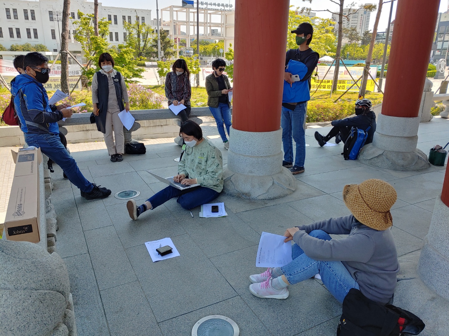 모여서 회의를 할 수가 없으니 띄엄띄엄 앉아서 했고요.