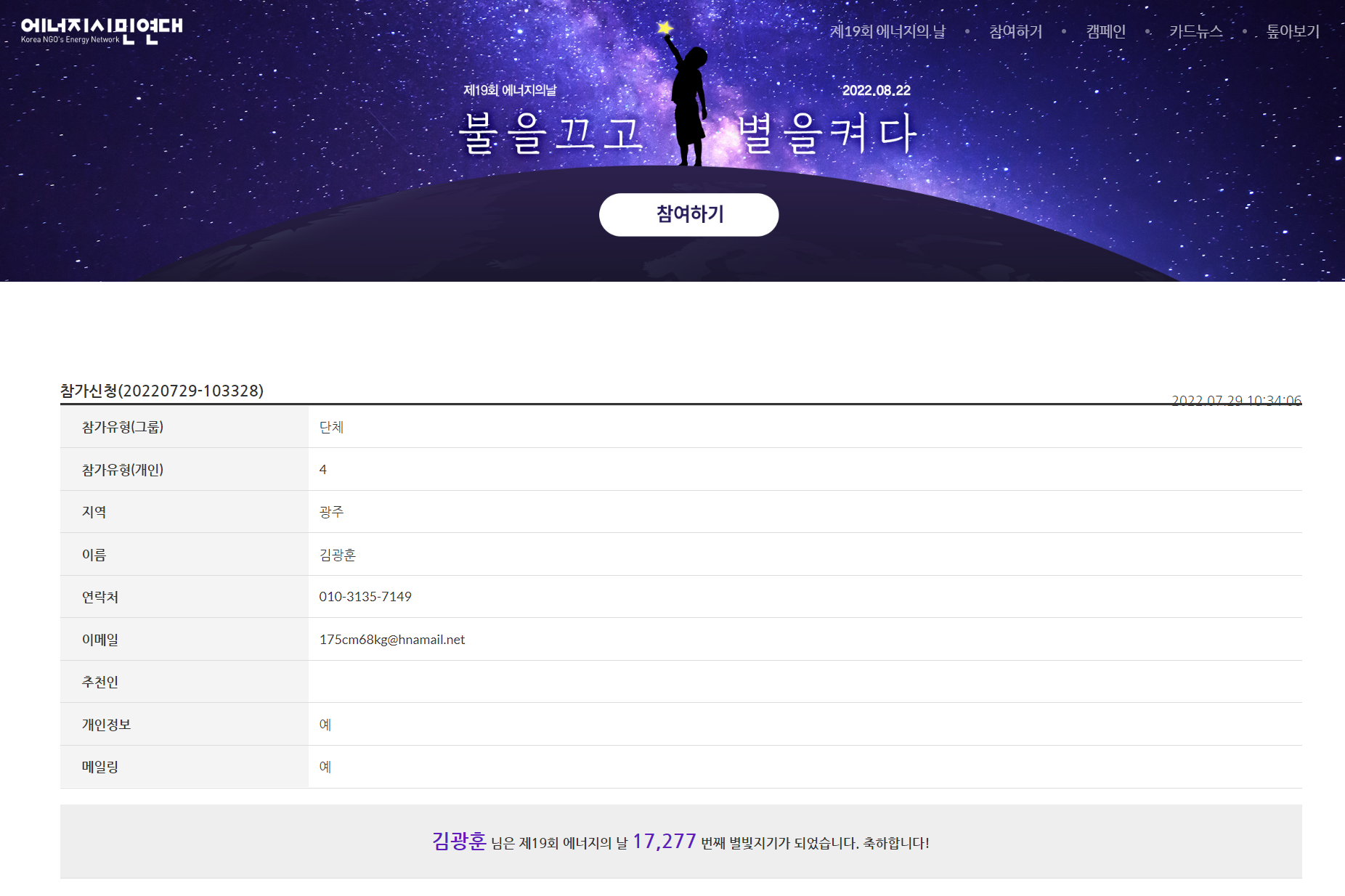 2. 별빛지기 신청하기 → 추천인 : 광주에너지파크