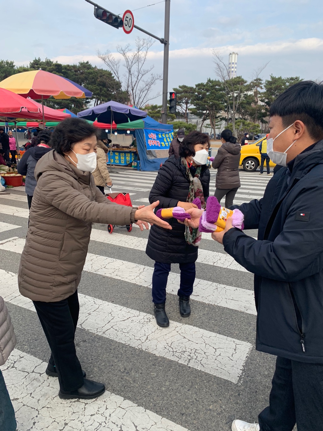 거리캠페인을 하며, 수면양말을 시민들에게 나누고 있는 모습입니다.